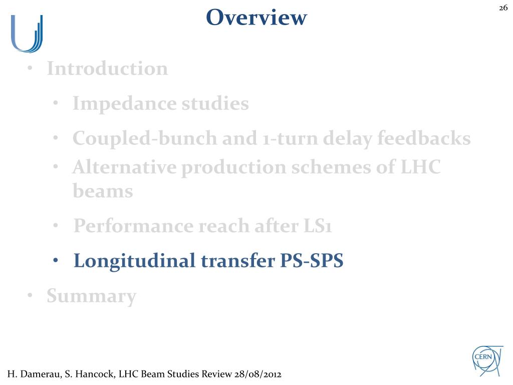 Overview • Introduction • Impedance studies • Coupled-bunch and 1-turn delay feedbacks • Alternative production schemes of LHC beams • Performance reach after LS1 • Longitudinal transfer PS-SPS • Summary