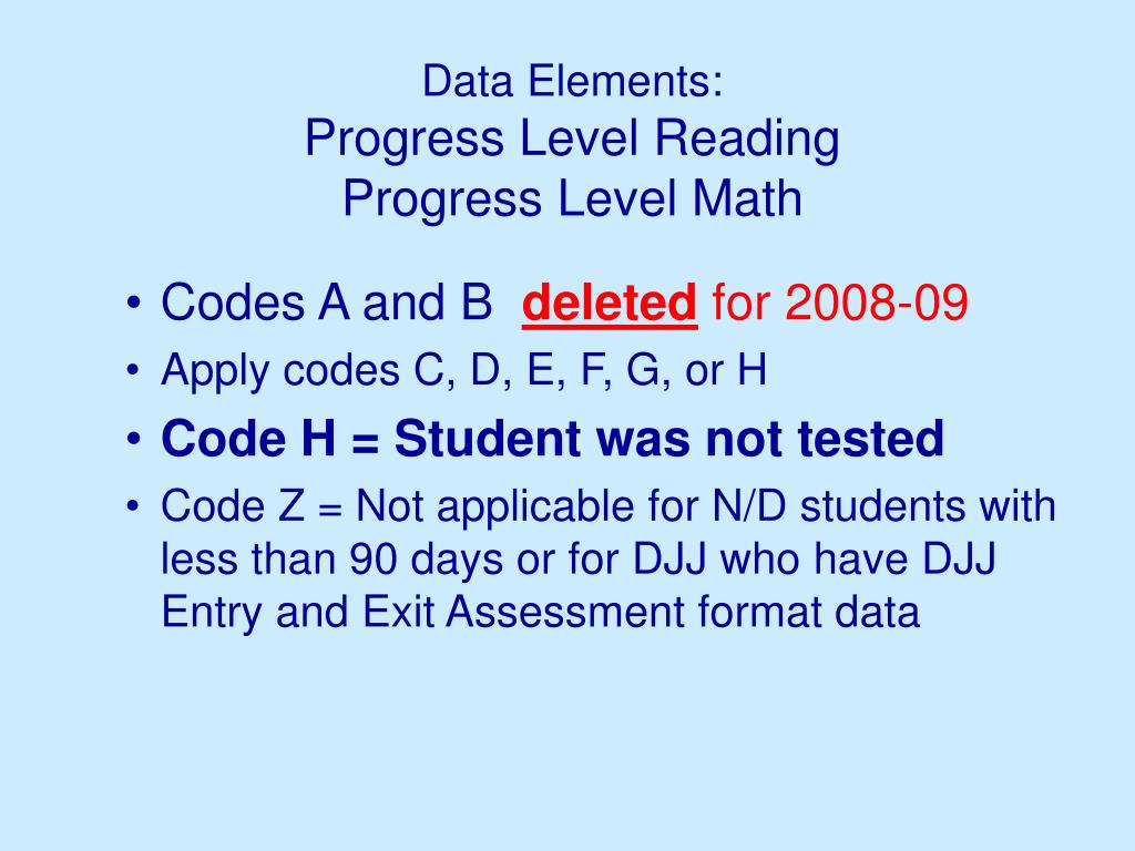 Data Elements: Progress Level Reading Progress Level Math • Codes A and B deleted for 2008-09 • Apply codes C, D, E, F, G, or H • Code H = Student was not tested • Code Z = Not applicable for N/D students with less than 90 days or for DJJ who have DJJ Entry and Exit Assessment format data