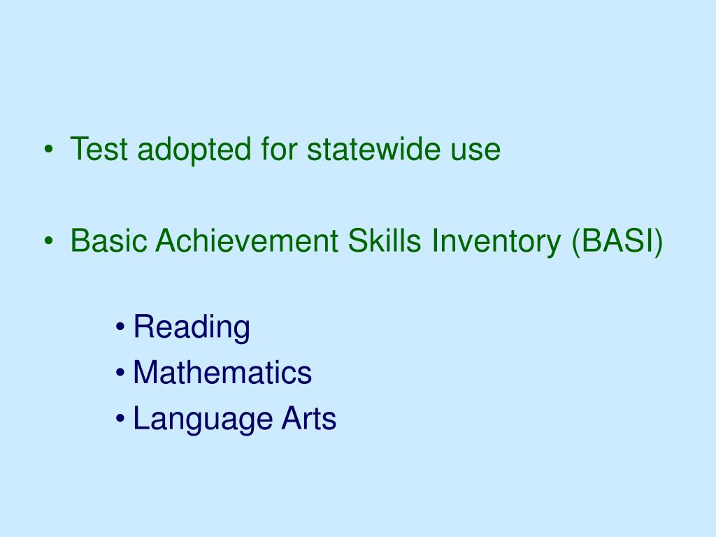 Test adopted for statewide use • Basic Achievement Skills Inventory (BASI) • Reading • Mathematics • Language Arts