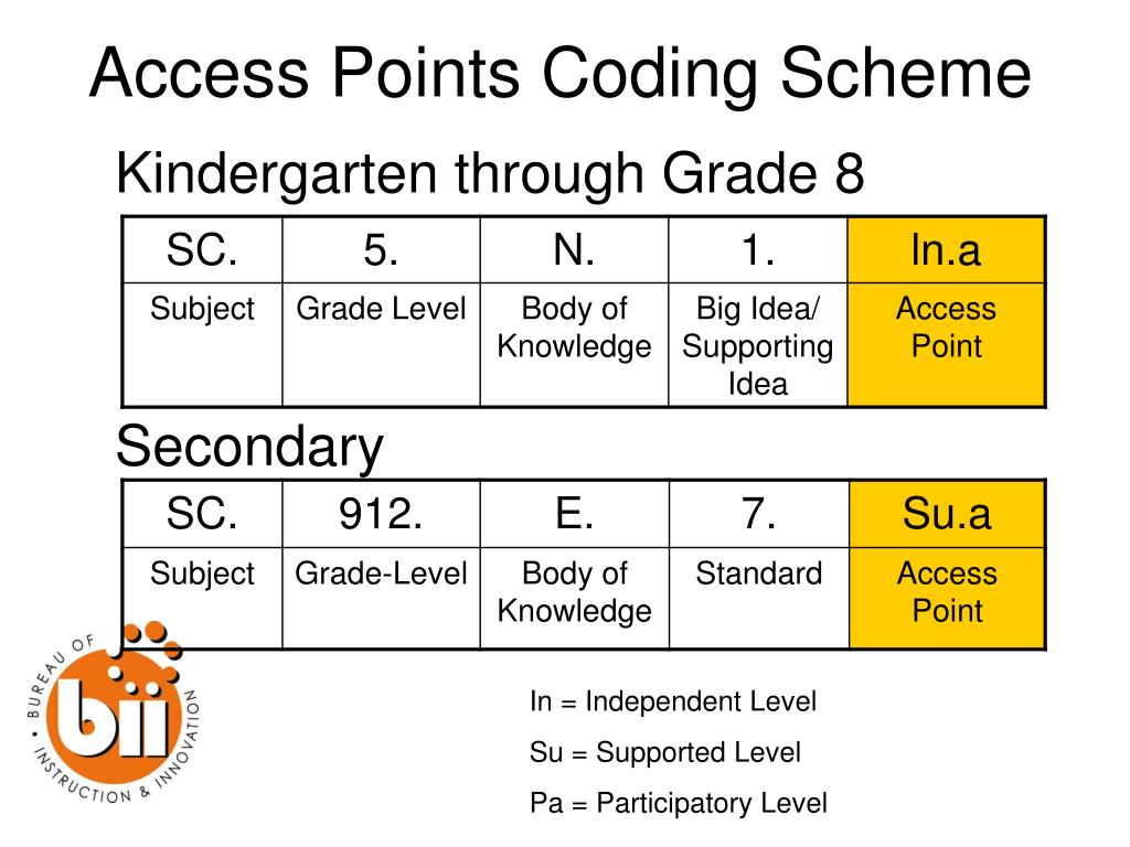 Access Points Coding Scheme Kindergarten through Grade 8 Secondary In = Independent Level Su = Supported Level Pa = Participatory Level