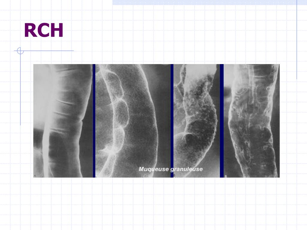 Biologie • Syndrome inflammatoire +++: augmentation de la CRP, VS, Plaquettes, leucocytose • Anémie • Désordres électrolytiques hypokaliémie, hypomagnésémie, hypocalcémie, hypoalbuminémie • Bilan hépatique perturbé (cholangite sclérosante) • ASCA+/ANCA- MC.ASCA-/ANCA+ RCH