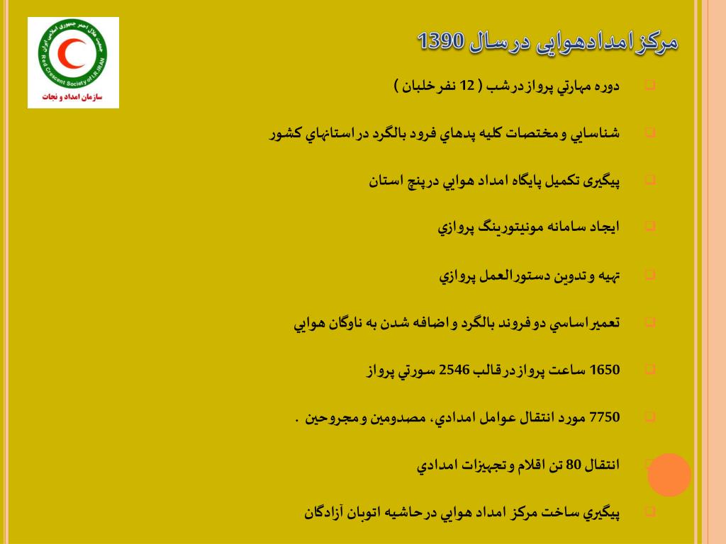 مرکز امدادهوایی در سال 1390 • دوره مهارتي پرواز در شب ( 12 نفر خلبان ) • شناسايي و مختصات كليه پدهاي فرود بالگرد در استانهاي كشور • پیگیری تکمیل پايگاه امداد هوايي در پنچ استان • ايجاد سامانه مونيتورينگ پروازي • تهيه و تدوين دستورالعمل پروازي • تعمير اساسي دو فروند بالگرد و اضافه شدن به ناوگان هوايي • 1650 ساعت پرواز در قالب 2546 سورتي پرواز • 7750 مورد انتقال عوامل امدادي، مصدومين و مجروحين . • انتقال 80 تن اقلام و تجهيزات امدادي • پيگيري ساخت مركز امداد هوايي در حاشيه اتوبان آزادگان