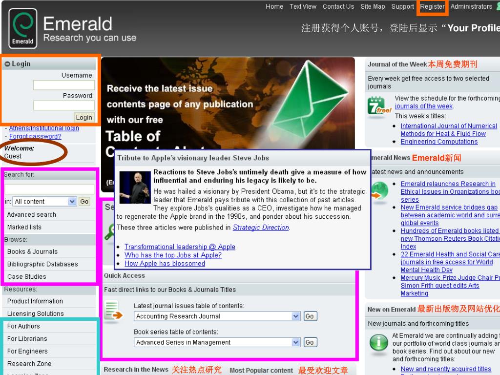 注册获得个人账号,登陆后显示“Your Profile” 本周免费期刊 Emerald新闻 最新出版物及网站优化 关注热点研究 最受欢迎文章