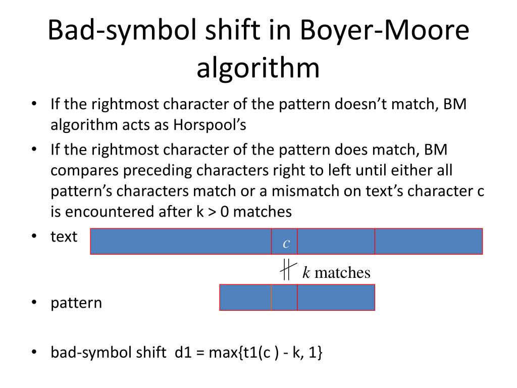 Bad-symbol shift in Boyer-Moore algorithm • If the rightmost character of the pattern doesn’t match, BM algorithm acts as Horspool’s • If the rightmost character of the pattern does match, BM compares preceding characters right to left until either all pattern’s characters match or a mismatch on text’s character c is encountered after k > 0 matches • text • pattern • bad-symbol shift d1 = max{t1(c ) - k, 1} c k matches