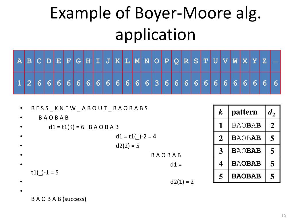 _ 6 A B C D E F G H I J K L M N O P Q R S T U V W X Y Z 1 2 6 6 6 6 6 6 6 6 6 6 6 6 3 6 6 6 6 6 6 6 6 6 6 6 Example of Boyer-Moore alg. application • B E S S _ K N E W _ A B O U T _ B A O B A B S • B A O B A B • d1 = t1(K) = 6 B A O B A B • d1 = t1(_)-2 = 4 • d2(2) = 5 • B A O B A B • d1 = t1(_)-1 = 5 • d2(1) = 2 • B A O B A B (success)