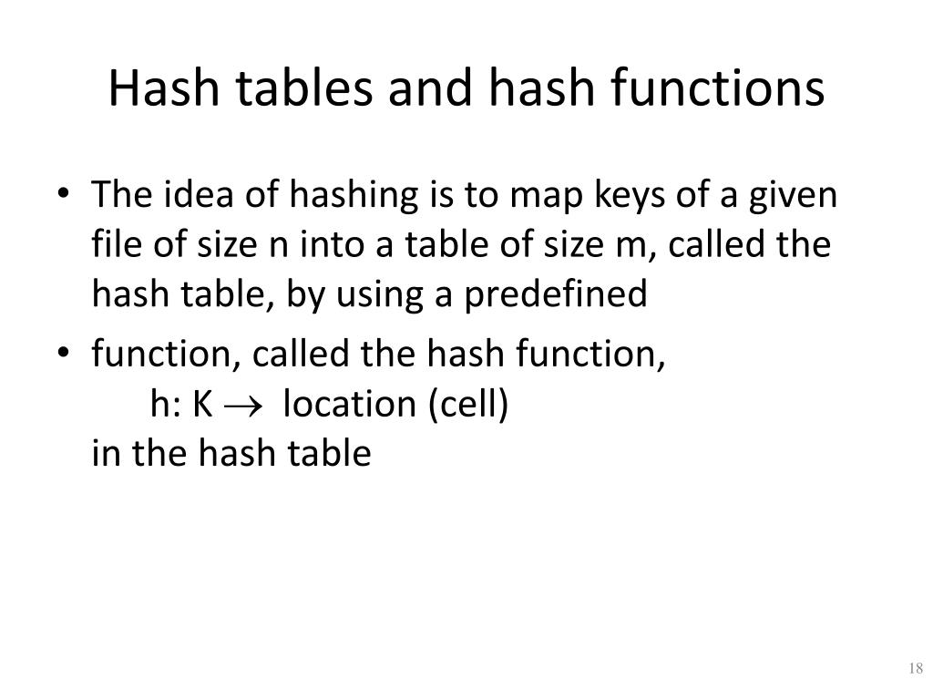Hash tables and hash functions • The idea of hashing is to map keys of a given file of size n into a table of size m, called the hash table, by using a predefined • function, called the hash function, h: K location (cell) in the hash table