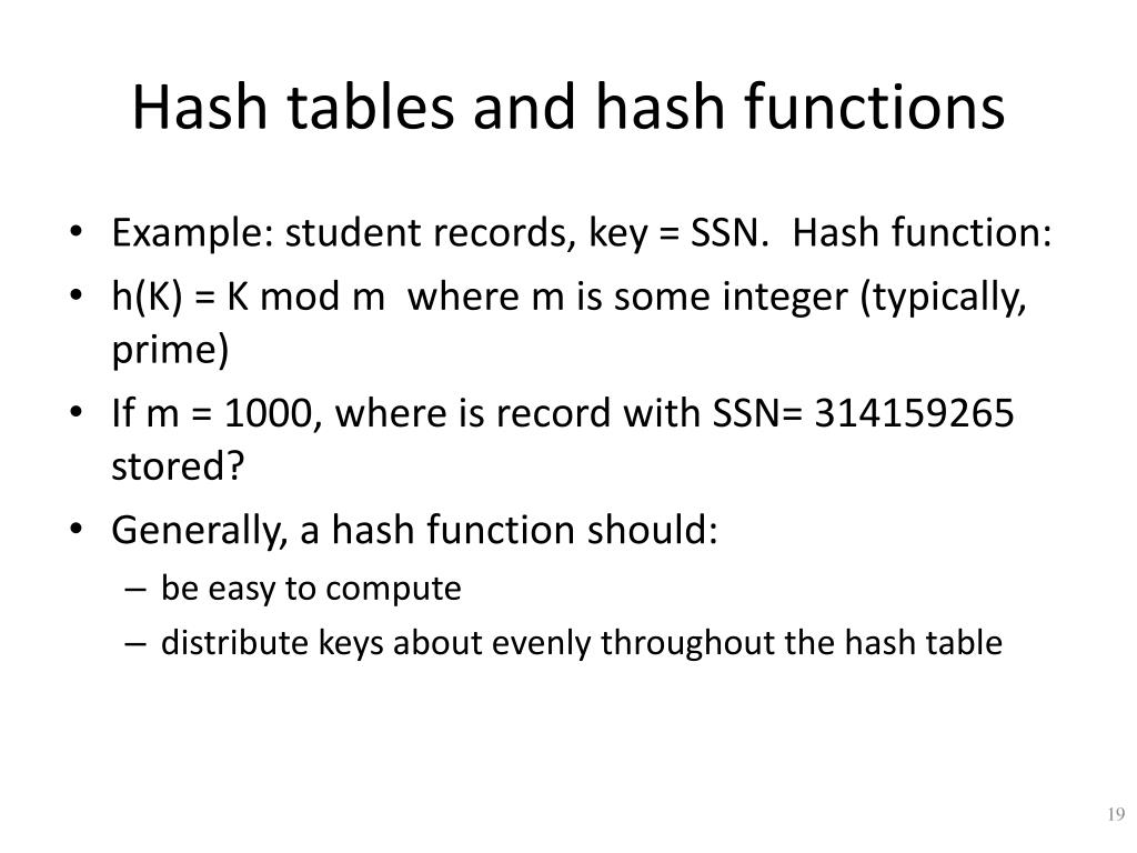 Hash tables and hash functions • Example: student records, key = SSN. Hash function: • h(K) = K mod m where m is some integer (typically, prime) • If m = 1000, where is record with SSN= 314159265 stored? • Generally, a hash function should: • be easy to compute • distribute keys about evenly throughout the hash table