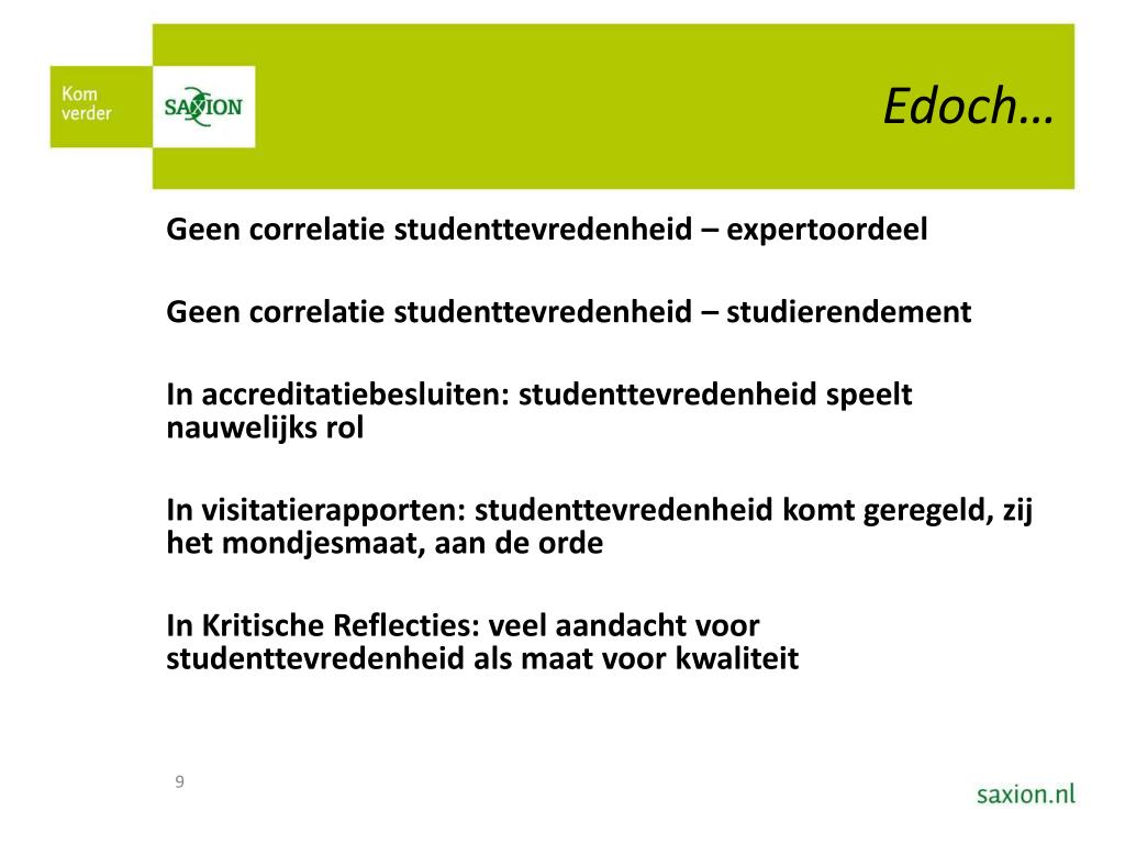 Edoch… Geen correlatie studenttevredenheid – expertoordeel Geen correlatie studenttevredenheid – studierendement In accreditatiebesluiten: studenttevredenheid speelt nauwelijks rol In visitatierapporten: studenttevredenheid komt geregeld, zij het mondjesmaat, aan de orde In Kritische Reflecties: veel aandacht voor studenttevredenheid als maat voor kwaliteit