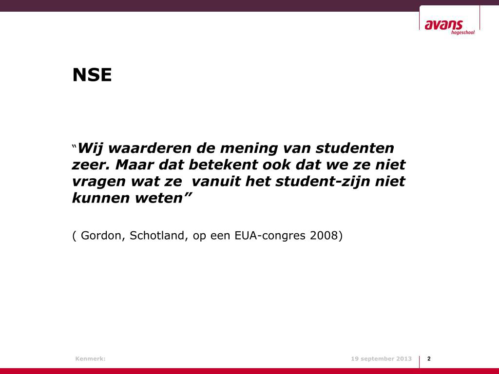 Studenttevredenheid als kwaliteitsmaat?. NNK platform HBO - 19 september 2013. NSE. “ Wij waarderen de mening van studenten zeer. Maar dat betekent ook dat we ze niet vragen wat ze vanuit het student-zijn niet kunnen weten” ( Gordon, Schotland, op een EUA-congres 2008). NSE.