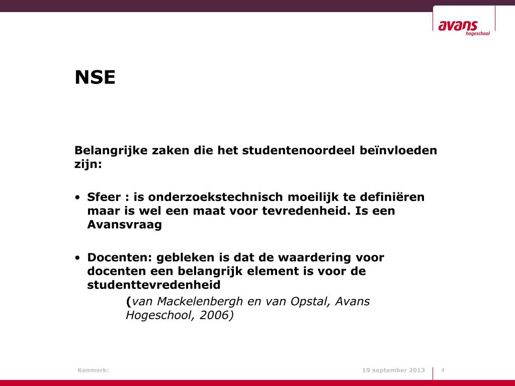 NSE Belangrijke zaken die het studentenoordeel beïnvloeden zijn: • Sfeer : is onderzoekstechnisch moeilijk te definiëren maar is wel een maat voor tevredenheid. Is een Avansvraag • Docenten: gebleken is dat de waardering voor docenten een belangrijk element is voor de studenttevredenheid (van Mackelenbergh en van Opstal, Avans Hogeschool, 2006)