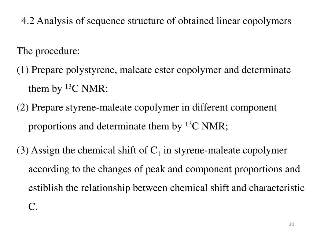 4.2 Analysis of sequence structure of obtained linear copolymers The procedure: Prepare polystyrene, maleate ester copolymer and determinate them by 13C NMR; Prepare styrene-maleate copolymer in different component proportions and determinate them by 13C NMR; (3) Assign the chemical shift of C1 in styrene-maleate copolymer according to the changes of peak and component proportions and estiblish the relationship between chemical shift and characteristic C.