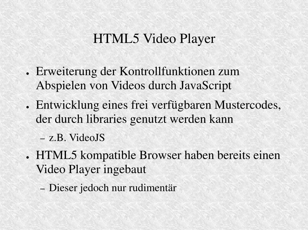HTML5 Video Player • Erweiterung der Kontrollfunktionen zum Abspielen von Videos durch JavaScript • Entwicklung eines frei verfügbaren Mustercodes, der durch libraries genutzt werden kann • z.B. VideoJS • HTML5 kompatible Browser haben bereits einen Video Player ingebaut • Dieser jedoch nur rudimentär