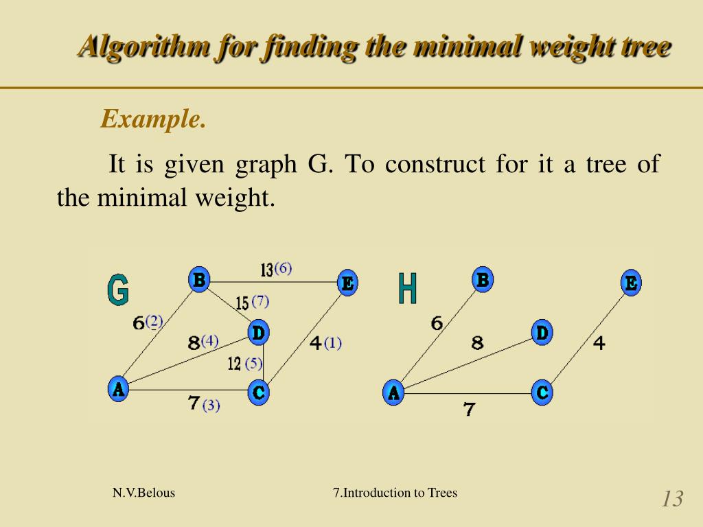 Algorithm for finding the minimal weight tree Example. It is given graph G. To construct for it a tree of the minimal weight. 7.Introduction to Trees