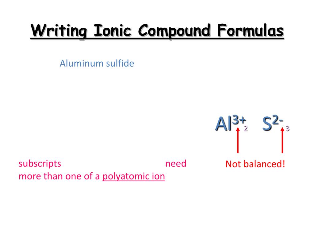 Writing Ionic Compound Formulas Example:Aluminum sulfide 1. Write the formulas for the cation and anion, including CHARGES! 2. Check to see if charges are balanced. Al3+ S2- 2 3 3. Balance charges , if necessary,usingsubscripts. Use parenthesesif youneed more than one of a polyatomic ion. Not balanced!