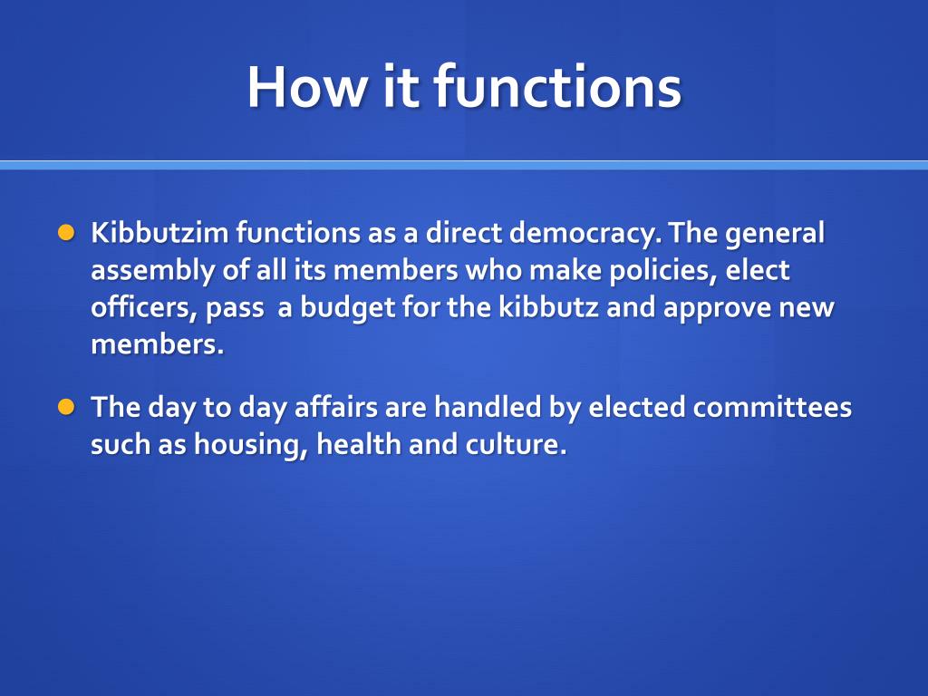 How it functions • Kibbutzim functions as a direct democracy. The general assembly of all its members who make policies, elect officers, pass a budget for the kibbutz and approve new members. • The day to day affairs are handled by elected committees such as housing, health and culture.