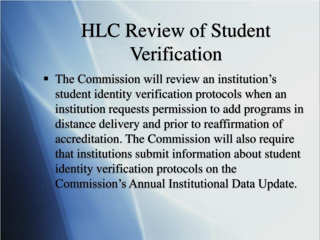 HLC Review of Student Verification • The Commission will review an institution’s student identity verification protocols when an institution requests permission to add programs in distance delivery and prior to reaffirmation of accreditation. The Commission will also require that institutions submit information about student identity verification protocols on the Commission’s Annual Institutional Data Update.