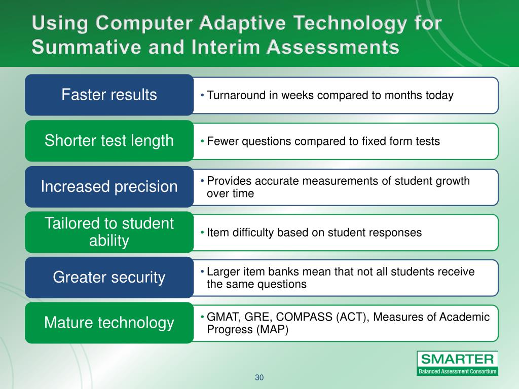 Faster results • Turnaround in weeks compared to months today Using Computer Adaptive Technology for Summative and Interim Assessments Shorter test length • Fewer questions compared to fixed form tests Increased precision • Provides accurate measurements of student growth over time Tailored to student ability • Item difficulty based on student responses Greater security • Larger item banks mean that not all students receive the same questions Mature technology • GMAT, GRE, COMPASS (ACT), Measures of Academic Progress (MAP)