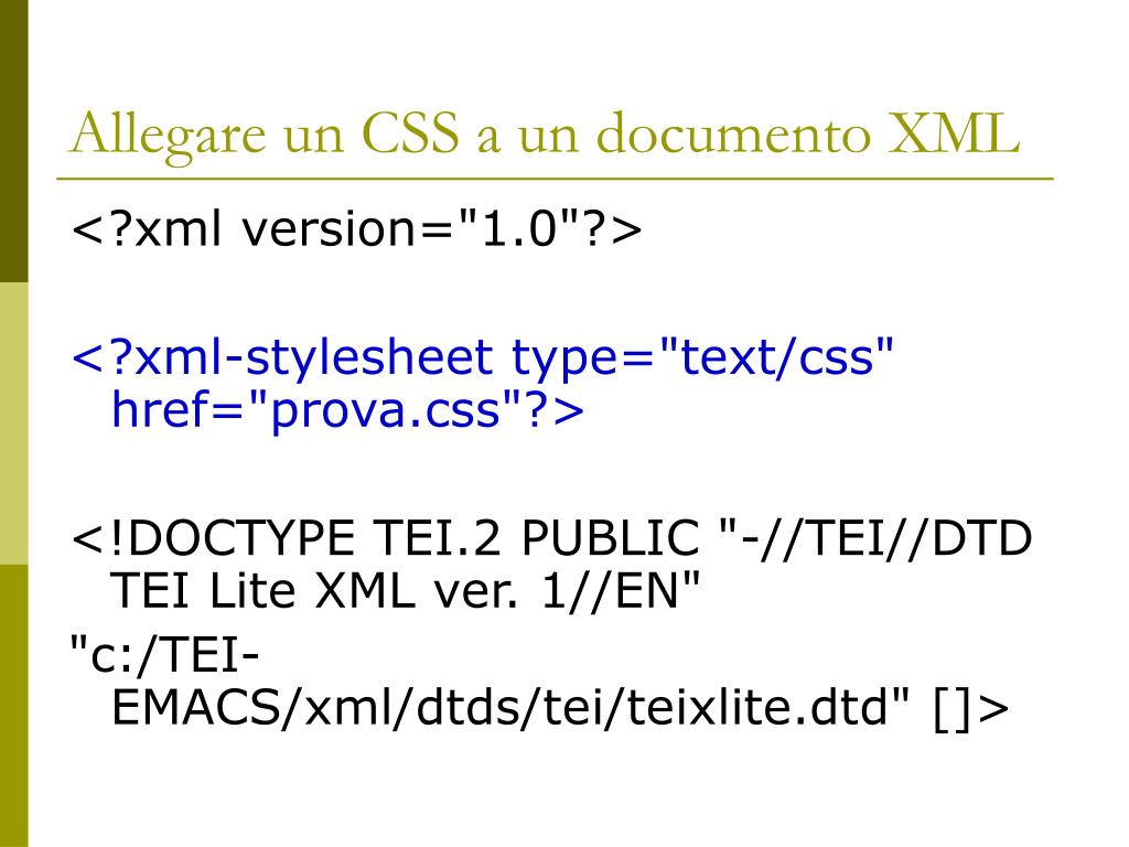 Allegare un CSS a un documento XML <?xml version="1.0"?> <?xml-stylesheet type="text/css" href="prova.css"?> <!DOCTYPE TEI.2 PUBLIC "-//TEI//DTD TEI Lite XML ver. 1//EN" "c:/TEI-EMACS/xml/dtds/tei/teixlite.dtd" []>