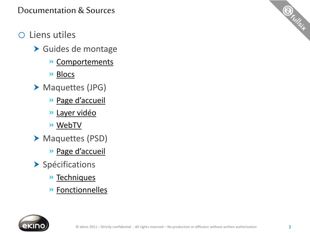 Documentation & Sources • Liens utiles • Guides de montage • Comportements • Blocs • Maquettes (JPG) • Page d’accueil • Layer vidéo • WebTV • Maquettes (PSD) • Page d’accueil • Spécifications • Techniques • Fonctionnelles