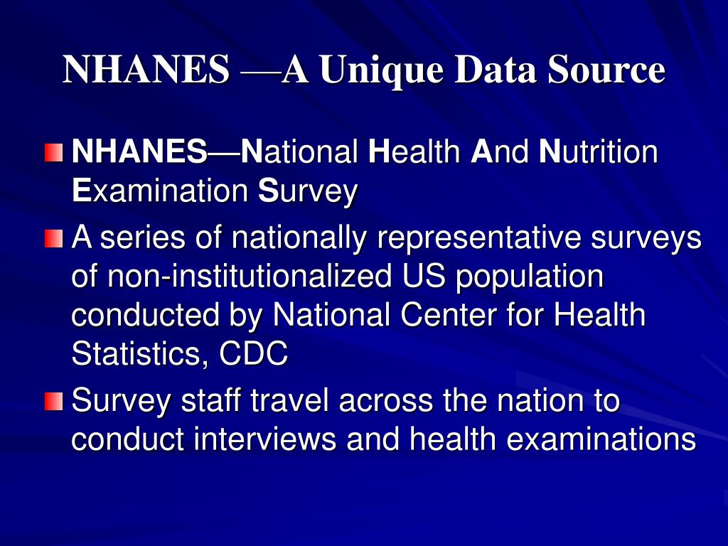 NHANES —A Unique Data Source • NHANES—National Health And Nutrition Examination Survey • A series of nationally representative surveys of non-institutionalized US population conducted by National Center for Health Statistics, CDC • Survey staff travel across the nation to conduct interviews and health examinations