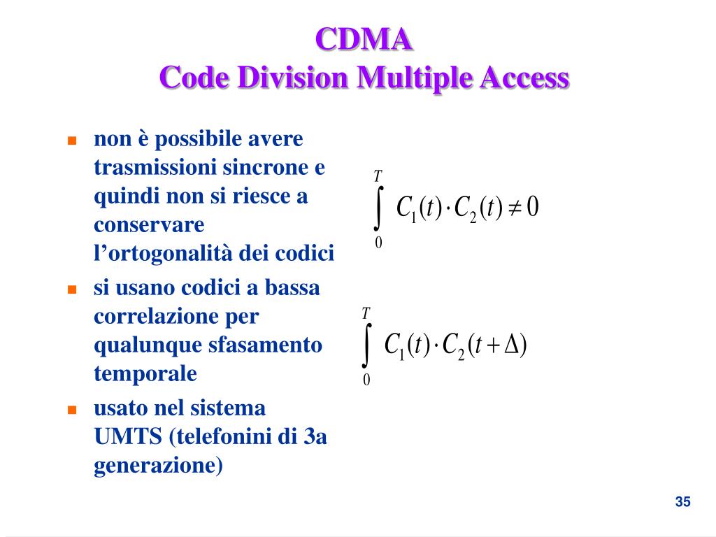 CDMACode Division Multiple Access • non è possibile avere trasmissioni sincrone e quindi non si riesce a conservare l’ortogonalità dei codici • si usano codici a bassa correlazione per qualunque sfasamento temporale • usato nel sistema UMTS (telefonini di 3a generazione)