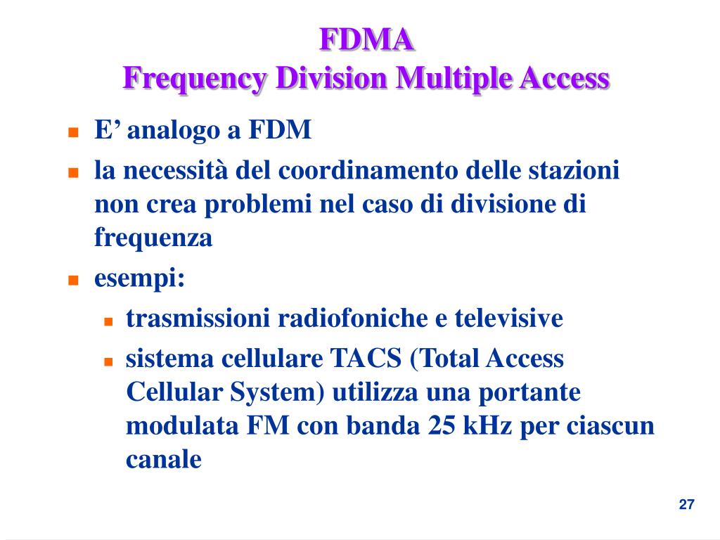FDMA Frequency Division Multiple Access • E’ analogo a FDM • la necessità del coordinamento delle stazioni non crea problemi nel caso di divisione di frequenza • esempi: • trasmissioni radiofoniche e televisive • sistema cellulare TACS (Total Access Cellular System) utilizza una portante modulata FM con banda 25 kHz per ciascun canale