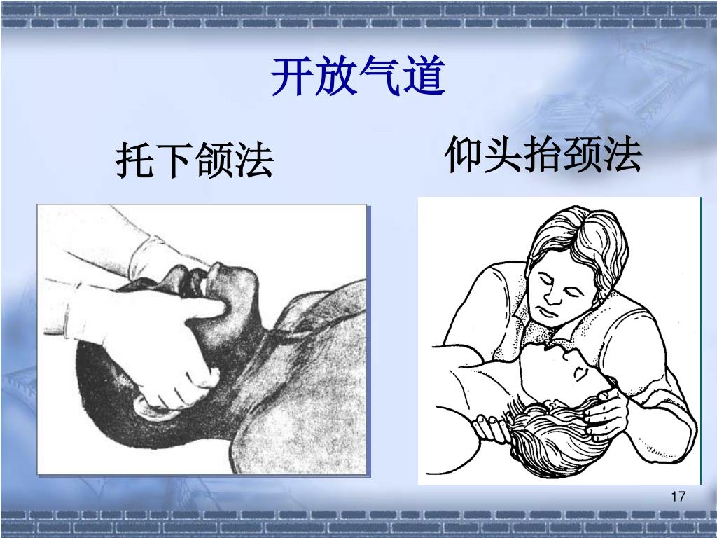 Basic Life Support —Airway A:保持呼吸道通畅 头后仰、托下颌、张口(徒手三步手法) • 口腔内容物可用手挖出 • 气道异物 • 溺水者排水法(俯卧位法)