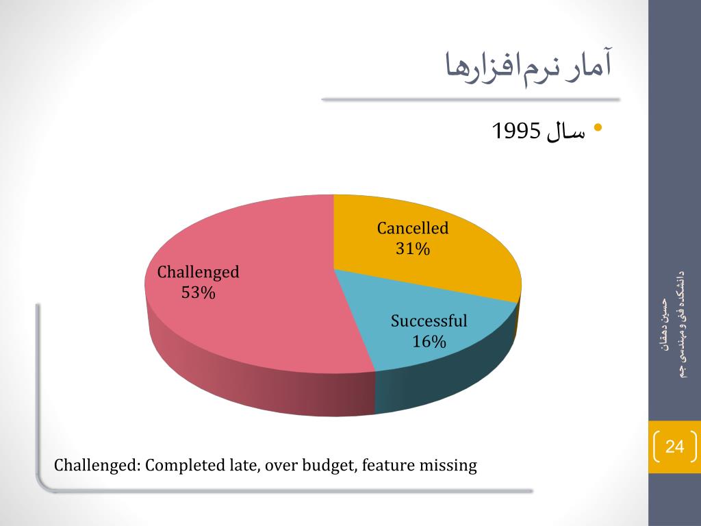 آمار نرمافزارها • سال 1995 حسین دهقان دانشکده فنی و مهندسی جم Challenged: Completed late, over budget, feature missing