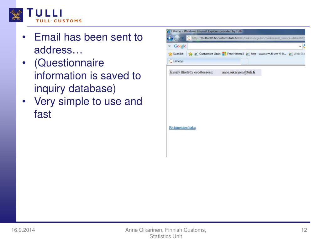 Email has been sent to address… • (Questionnaire information is saved to inquiry database) • Very simple to use and fast Anne Oikarinen, Finnish Customs, Statistics Unit