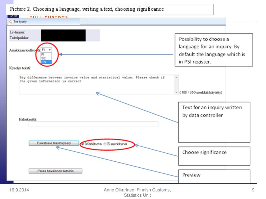 Requirements There should be a convenient way to write the inquiry text and possibility to choose if an inquiry is “significant or not”. This means that if inquiry is significant the declaration line is automatically marked as an error and will be left out of the statistical data. This is suitable for situation where declaration contains an obvious error and correction can’t be done without any clarification from PSI. Is it also possible to make an non-significant inquiry. Then the declaration line is not marked as an error, and will be included in statistical data, but there are some suspicious features in the declaration and again explanation from PSI is needed (Picture 2.) Anne Oikarinen, Finnish Customs, Statistics Unit