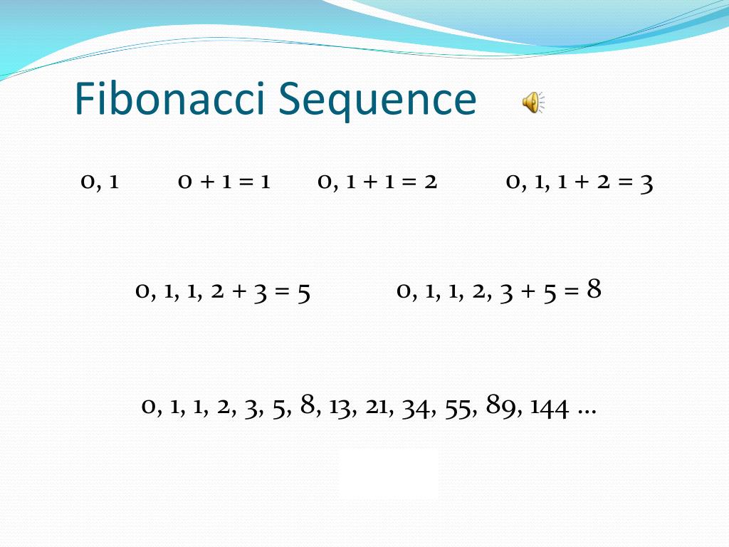 Fibonacci Sequence 0, 1 0 + 1 = 1 0, 1 + 1 = 2 0, 1, 1 + 2 = 3 0, 1, 1, 2 + 3 = 5 0, 1, 1, 2, 3 + 5 = 8 0, 1, 1, 2, 3, 5, 8, 13, 21, 34, 55, 89, 144 …