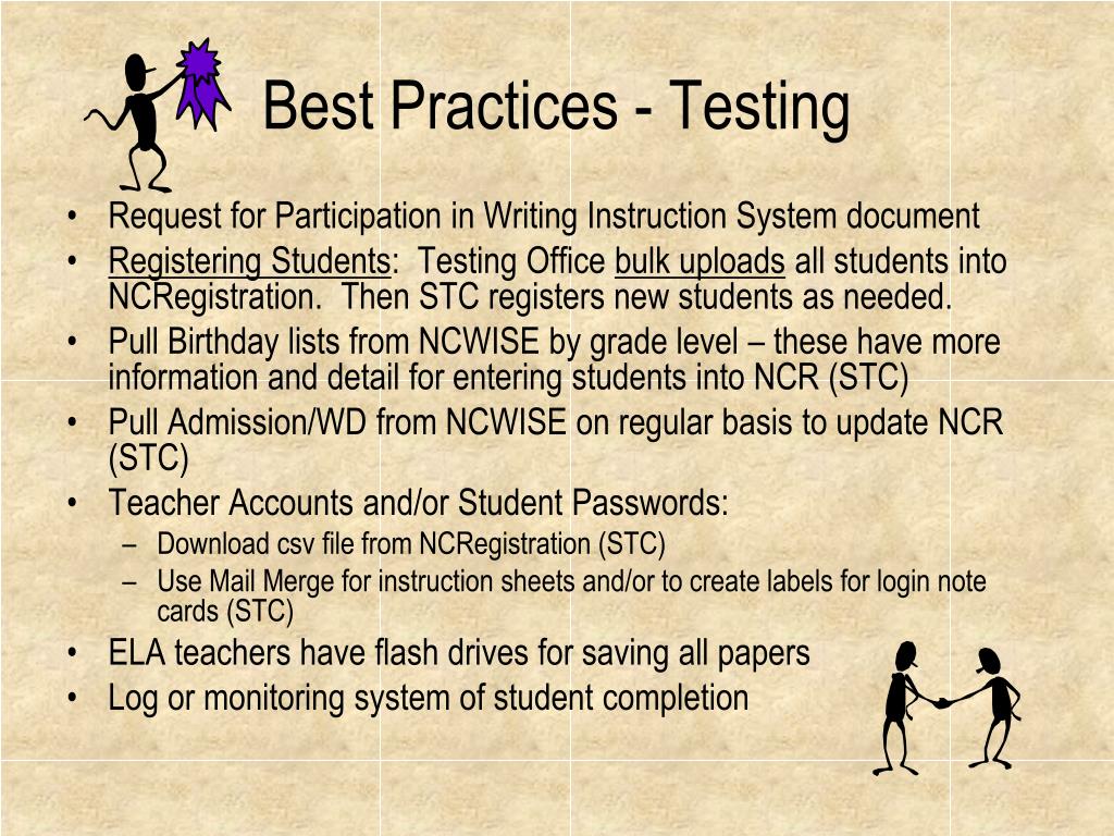 Best Practices - Testing • Request for Participation in Writing Instruction System document • Registering Students: Testing Office bulk uploads all students into NCRegistration. Then STC registers new students as needed. • Pull Birthday lists from NCWISE by grade level – these have more information and detail for entering students into NCR (STC) • Pull Admission/WD from NCWISE on regular basis to update NCR (STC) • Teacher Accounts and/or Student Passwords: • Download csv file from NCRegistration (STC) • Use Mail Merge for instruction sheets and/or to create labels for login note cards (STC) • ELA teachers have flash drives for saving all papers • Log or monitoring system of student completion