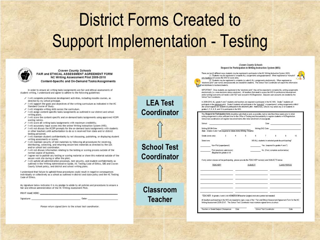 District Trainings to Support Implementation - Testing • LEA Test Coordinator trains School Test Coordinators in September • Comprehensive Guide 2009-2010 North Carolina Instruction System • Craven County Schools Writing Instruction System Procedures • School Test Coordinator Responsibilities and Quick Reference Guide • NCRegistration • Test Security • LEA Test Coordinator includes Writing updates via email and testing update portion of other test trainings • School Test Coordinator is responsible for training school staff on district WIS Procedures