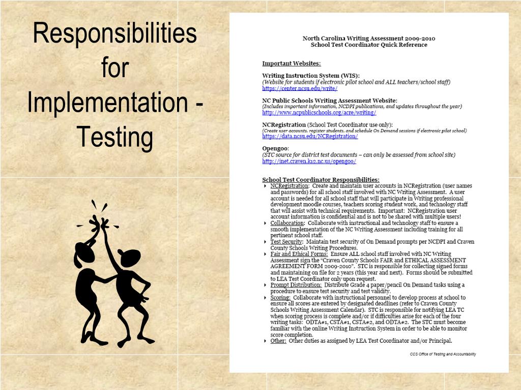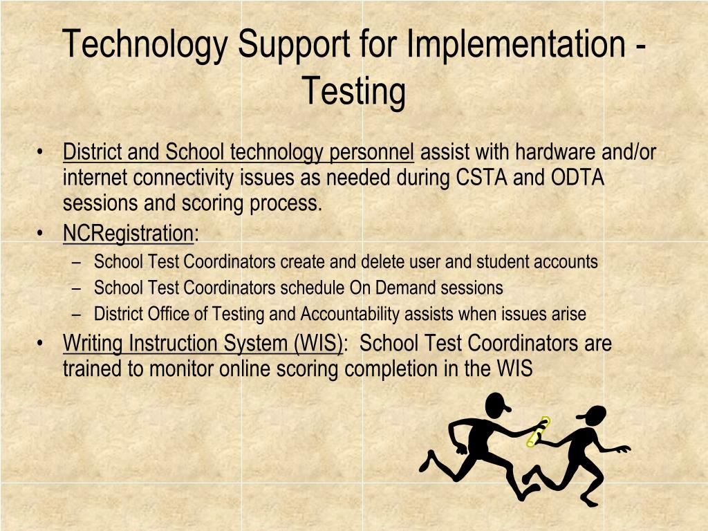 Technology Support for Implementation -Testing • District and School technology personnel assist with hardware and/or internet connectivity issues as needed during CSTA and ODTA sessions and scoring process. • NCRegistration: • School Test Coordinators create and delete user and student accounts • School Test Coordinators schedule On Demand sessions • District Office of Testing and Accountability assists when issues arise • Writing Instruction System (WIS): School Test Coordinators are trained to monitor online scoring completion in the WIS