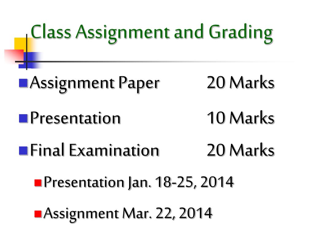 Class Assignment and Grading • Assignment Paper 20 Marks • Presentation 10 Marks • Final Examination 20 Marks • Presentation Jan. 18-25, 2014 • Assignment Mar. 22, 2014