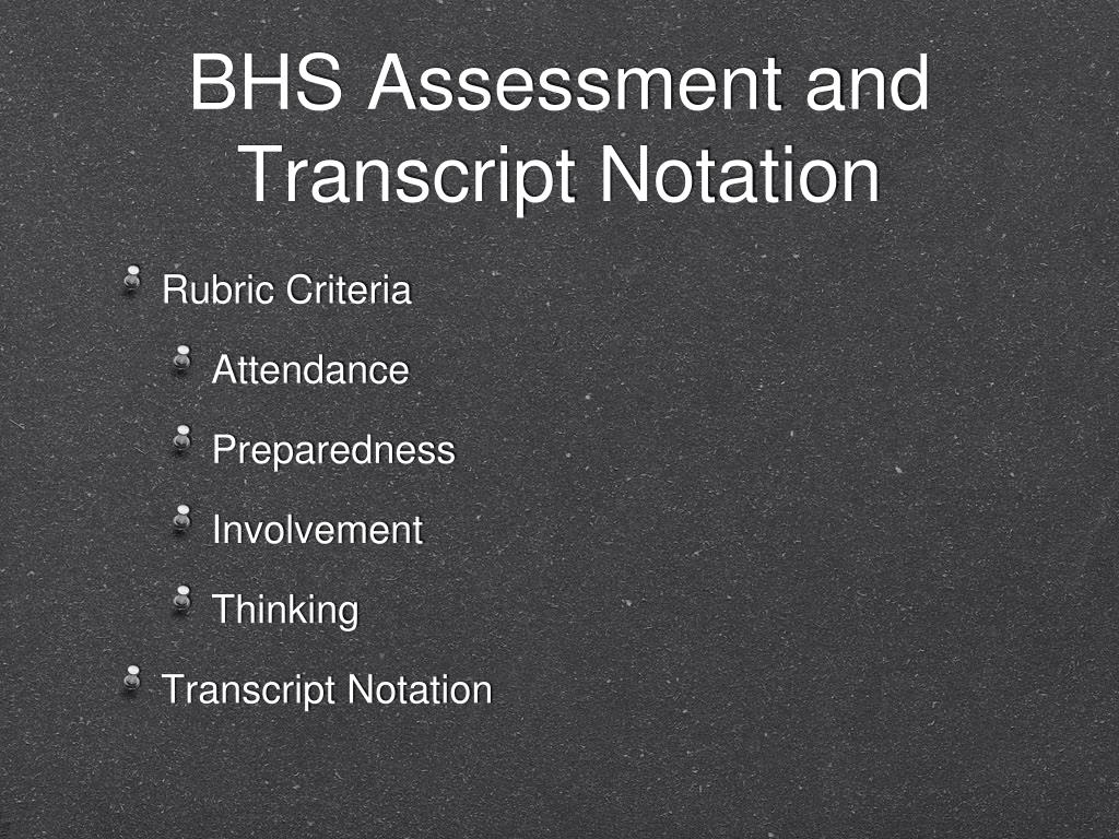 BHS Assessment and Transcript Notation • Rubric Criteria • Attendance • Preparedness • Involvement • Thinking • Transcript Notation