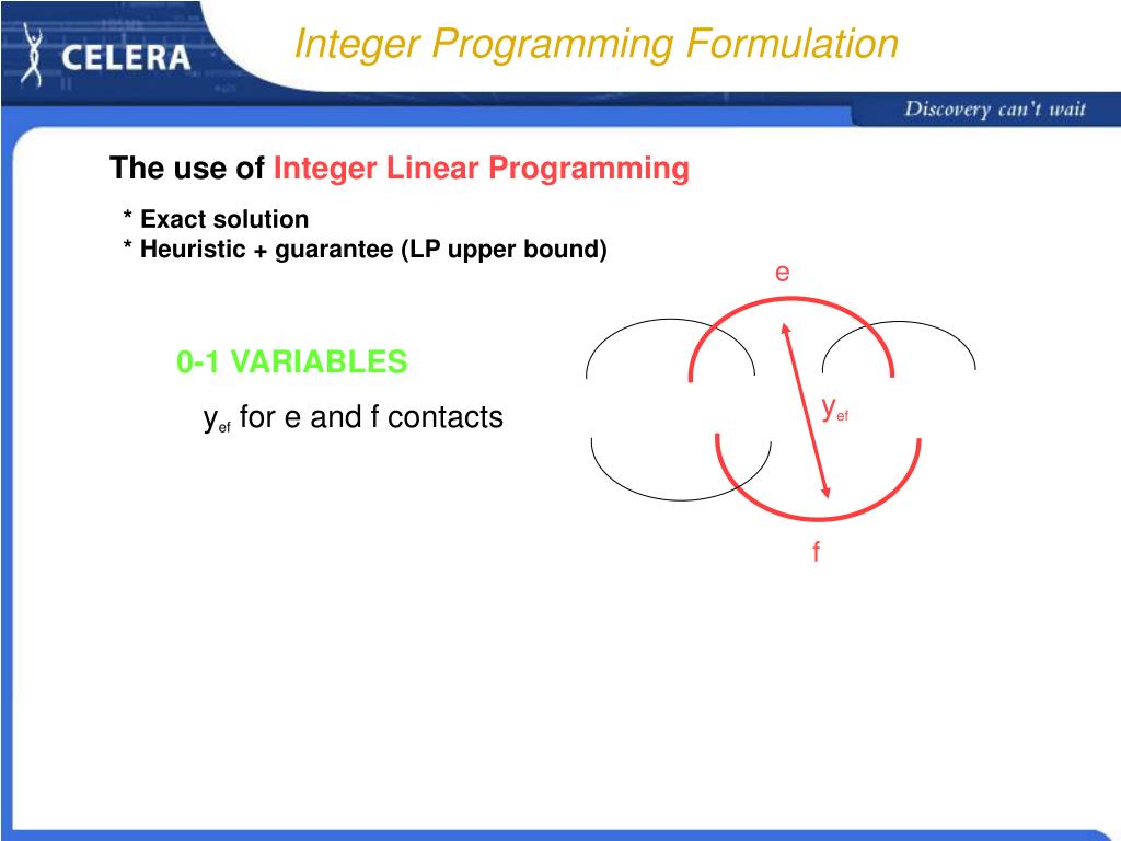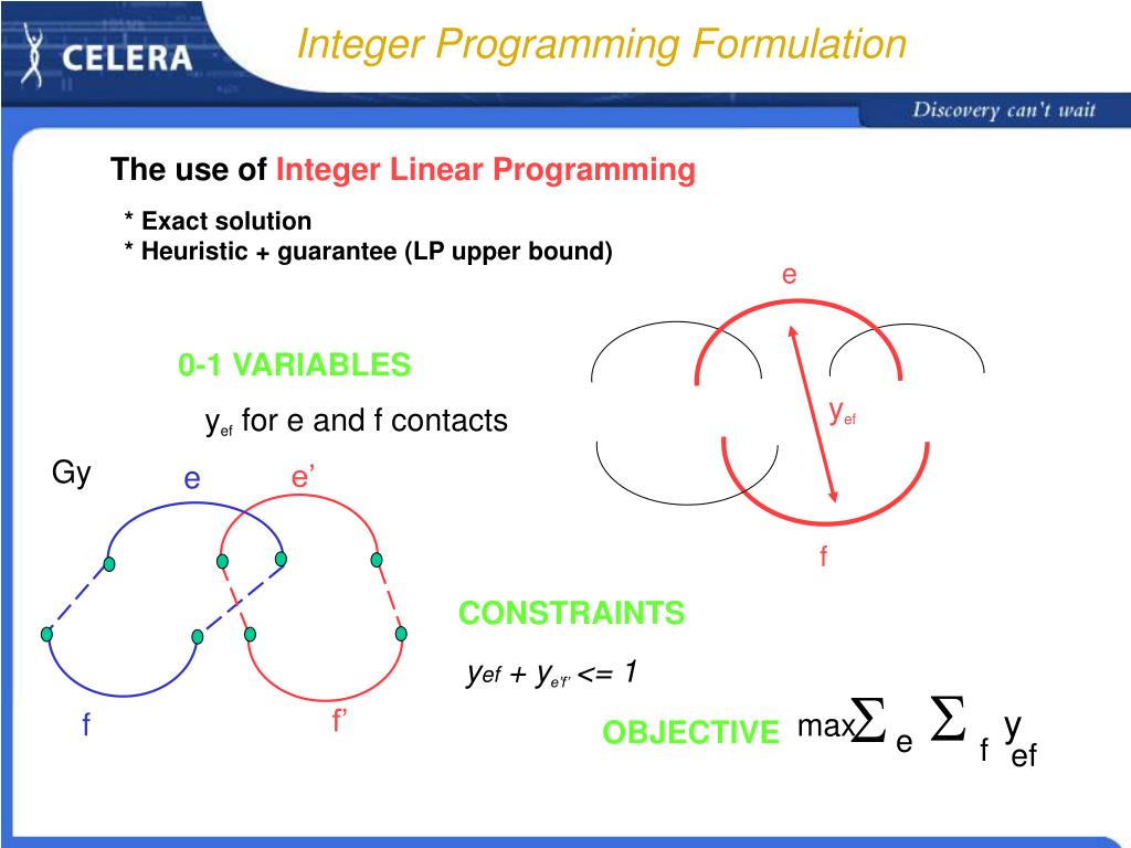 Integer Programming Formulation The use of Integer Linear Programming * Exact solution * Heuristic + guarantee (LP upper bound) e 0-1 VARIABLES yef yef for e and f contacts f