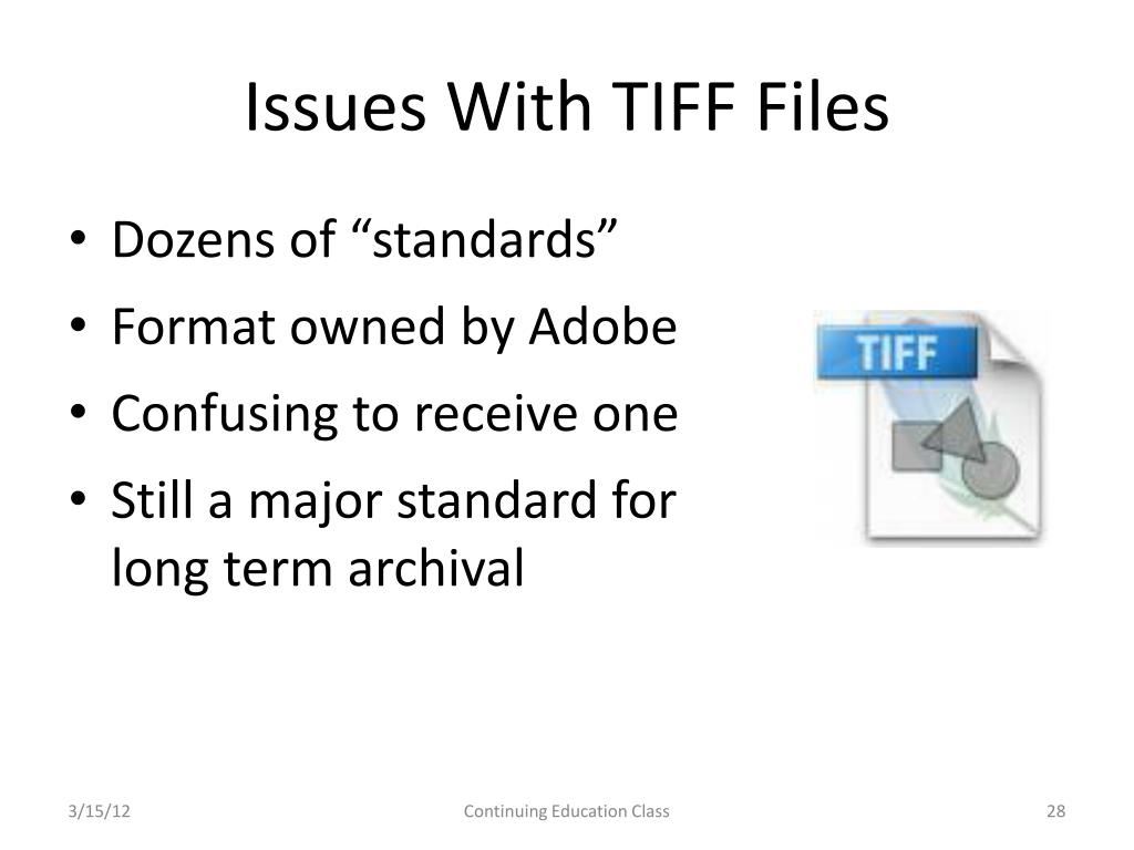 Issues With TIFF Files • Dozens of “standards” • Format owned by Adobe • Confusing to receive one • Still a major standard for long term archival Continuing Education Class