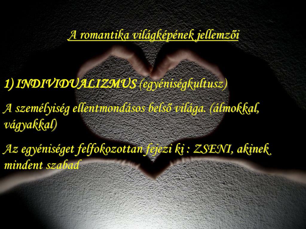 A romantika világképének jellemzői 1) INDIVIDUALIZMUS (egyéniségkultusz) A személyiség ellentmondásos belső világa. (álmokkal, vágyakkal) Az egyéniséget felfokozottan fejezi ki : ZSENI, akinek mindent szabad