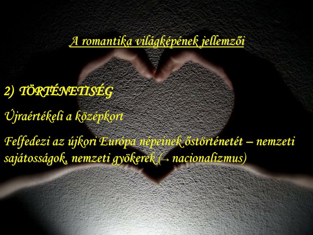 A romantika világképének jellemzői 2) TÖRTÉNETISÉG Újraértékeli a középkort Felfedezi az újkori Európa népeinek őstörténetét – nemzeti sajátosságok, nemzeti gyökerek (→nacionalizmus)