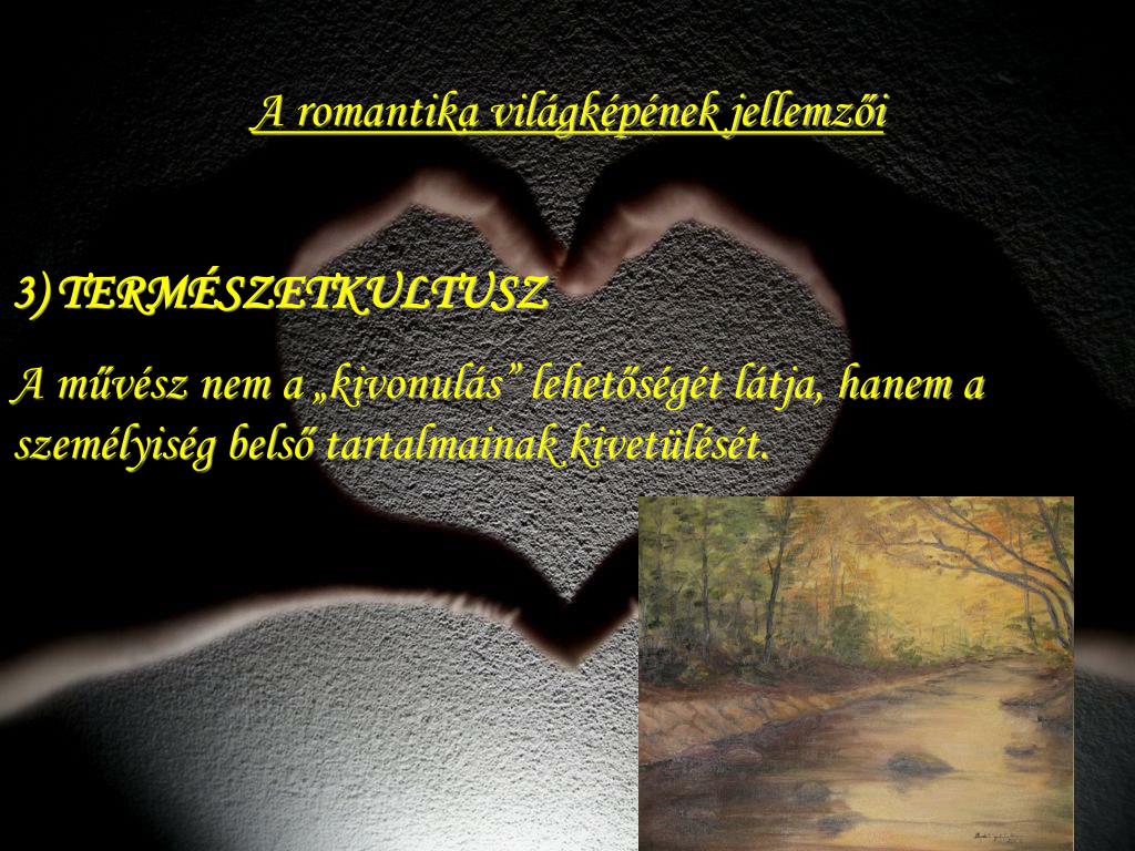 A romantika világképének jellemzői 3) TERMÉSZETKULTUSZ A művész nem a „kivonulás” lehetőségét látja, hanem a személyiség belső tartalmainak kivetülését.