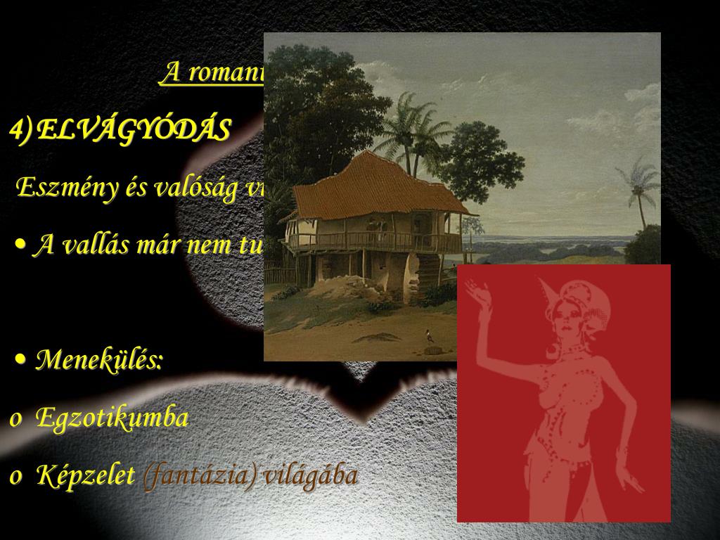 A romantika világképének jellemzői • 4) ELVÁGYÓDÁS • Eszmény és valóság viszonya ellentmondásos • A vallás már nem tudta magyarázni, megoldani • (→felvilágosodás) • Menekülés: • Egzotikumba • Képzelet (fantázia) világába