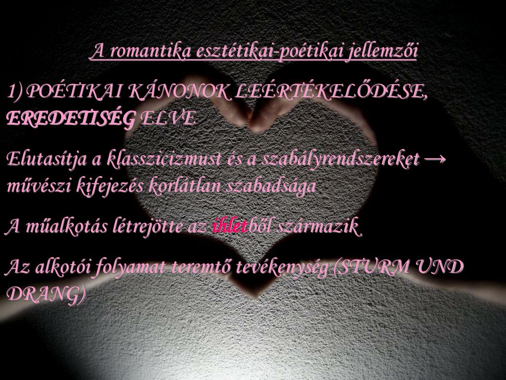 A romantika esztétikai-poétikai jellemzői 1) POÉTIKAI KÁNONOK LEÉRTÉKELŐDÉSE, EREDETISÉG ELVE Elutasítja a klasszicizmust és a szabályrendszereket → művészi kifejezés korlátlan szabadsága A műalkotás létrejötte az ihletből származik Az alkotói folyamat teremtő tevékenység (STURM UND DRANG)