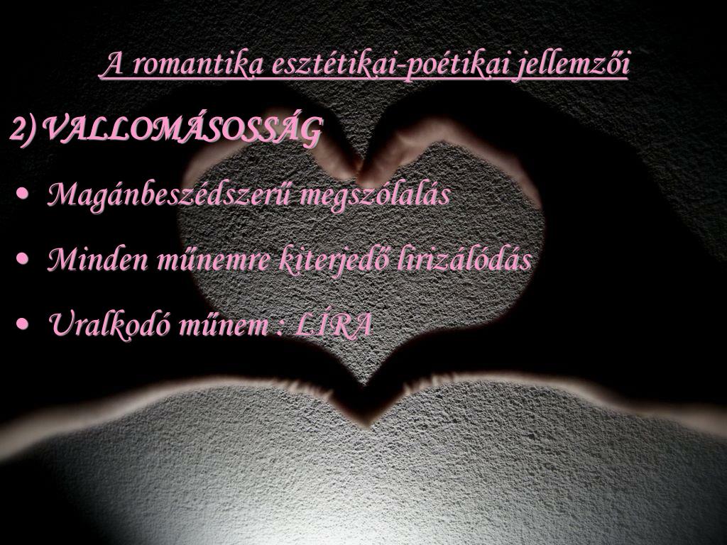 A romantika esztétikai-poétikai jellemzői • 2) VALLOMÁSOSSÁG • Magánbeszédszerű megszólalás • Minden műnemre kiterjedő lirizálódás • Uralkodó műnem : LÍRA