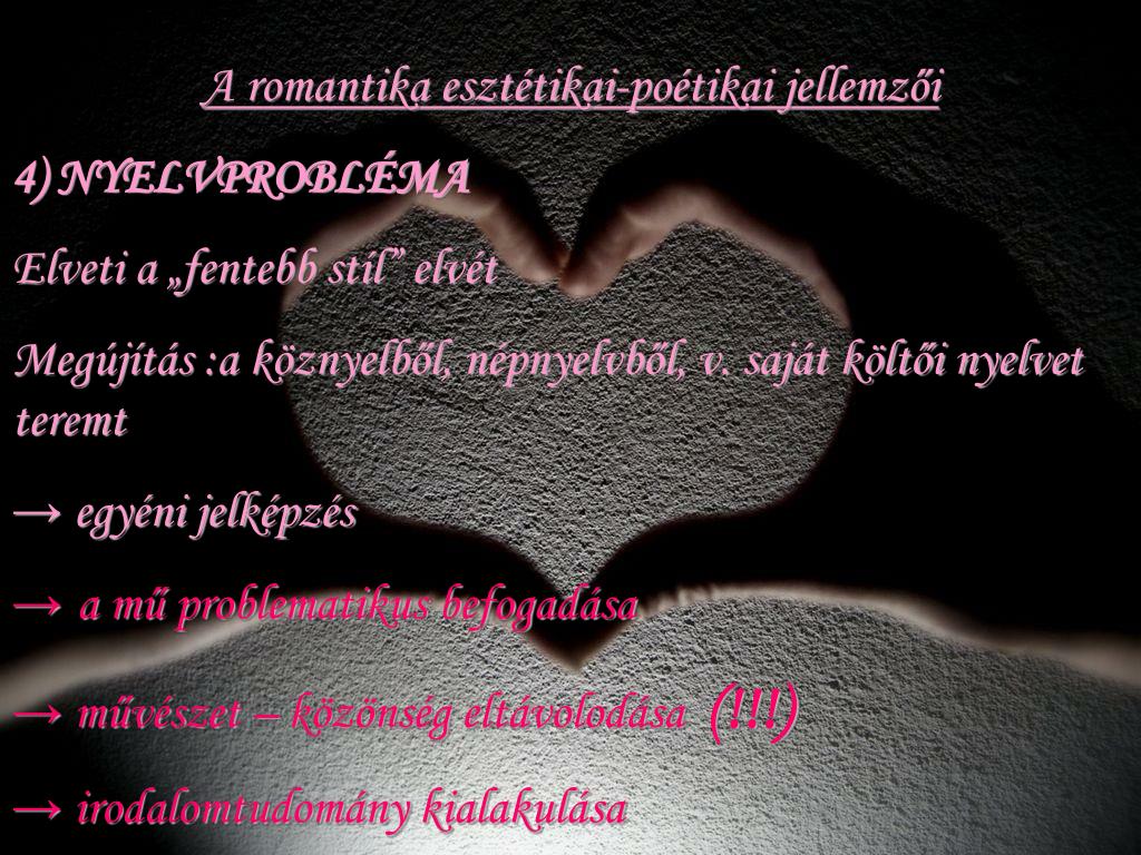 A romantika esztétikai-poétikai jellemzői 4) NYELVPROBLÉMA Elveti a „fentebb stíl” elvét Megújítás :a köznyelből, népnyelvből, v. saját költői nyelvet teremt → egyéni jelképzés → a mű problematikus befogadása → művészet – közönség eltávolodása (!!!) → irodalomtudomány kialakulása