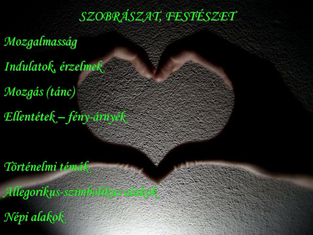 SZOBRÁSZAT, FESTÉSZET Mozgalmasság Indulatok, érzelmek Mozgás (tánc) Ellentétek – fény-árnyék Történelmi témák Allegorikus-szimbolikus alakok Népi alakok