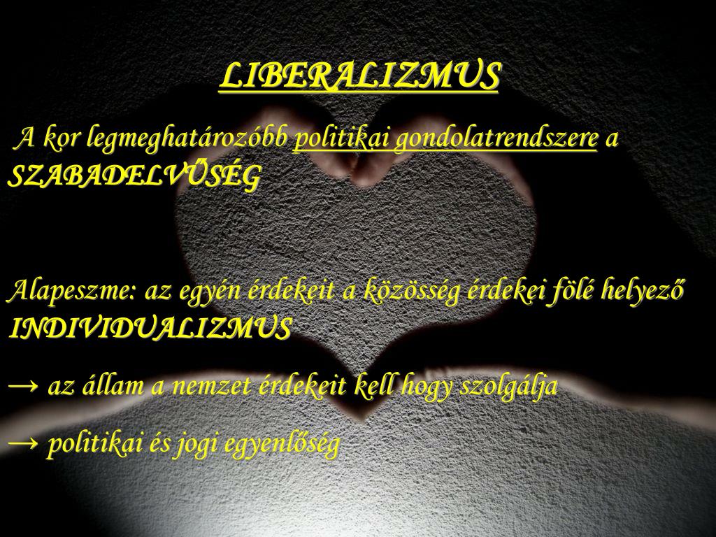 LIBERALIZMUS A kor legmeghatározóbb politikai gondolatrendszere a SZABADELVŰSÉG Alapeszme: az egyén érdekeit a közösség érdekei fölé helyező INDIVIDUALIZMUS → az állam a nemzet érdekeit kell hogy szolgálja → politikai és jogi egyenlőség