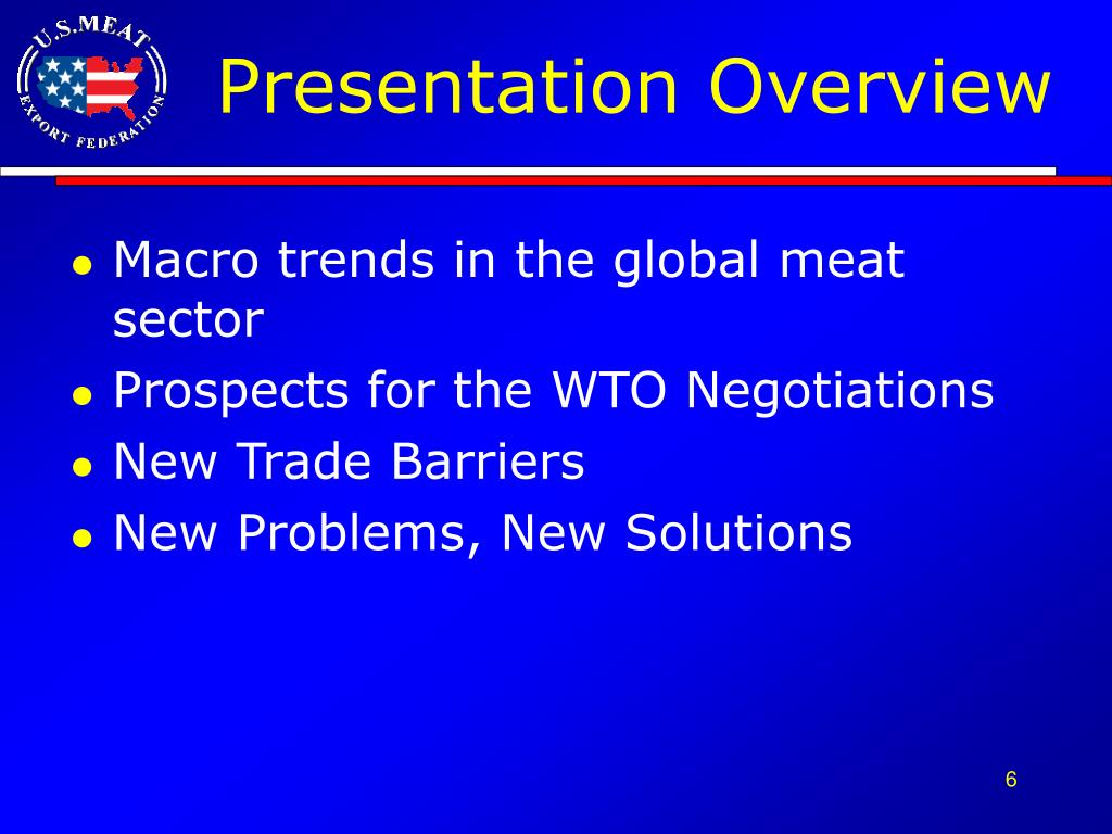Presentation Overview • Macro trends in the global meat sector • Prospects for the WTO Negotiations • New Trade Barriers • New Problems, New Solutions
