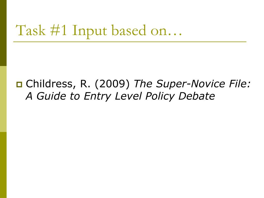 Task #1 Input based on… • Childress, R. (2009) The Super-Novice File: A Guide to Entry Level Policy Debate