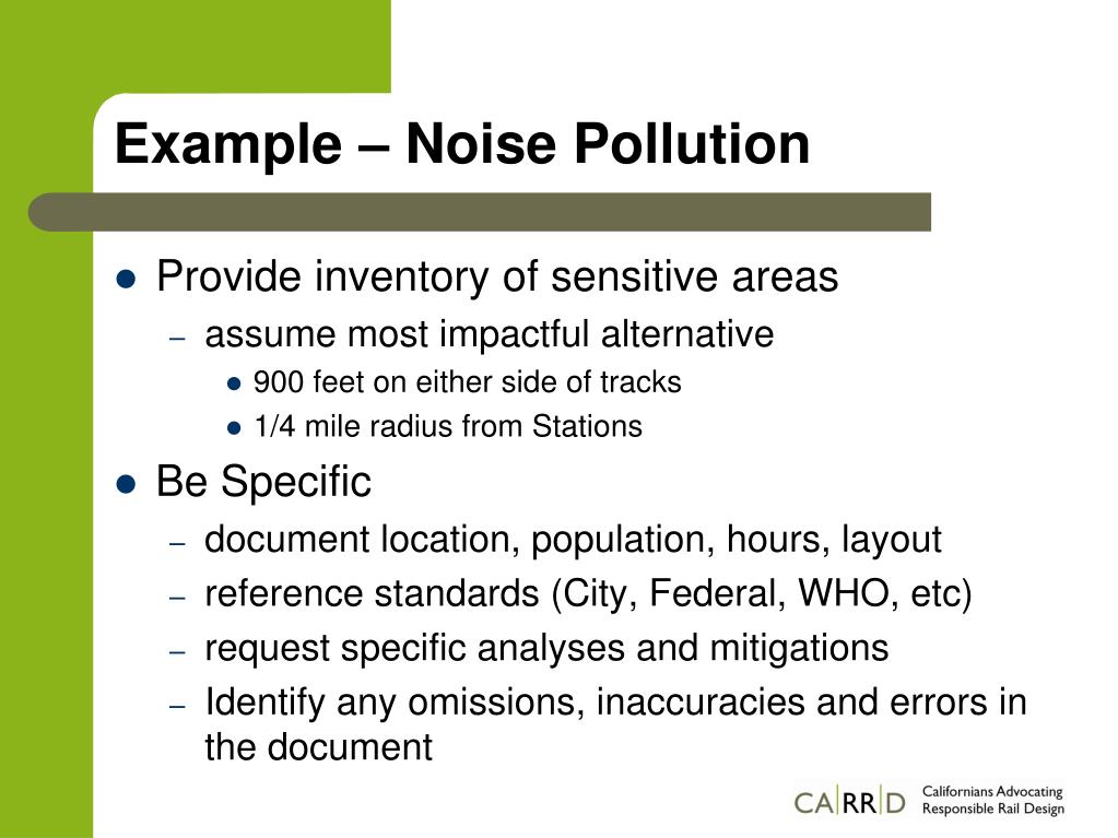 Example – Noise Pollution • Provide inventory of sensitive areas • assume most impactful alternative • 900 feet on either side of tracks • 1/4 mile radius from Stations • Be Specific • document location, population, hours, layout • reference standards (City, Federal, WHO, etc) • request specific analyses and mitigations • Identify any omissions, inaccuracies and errors in the document
